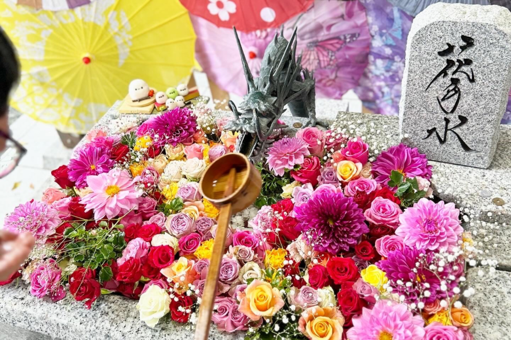 色とりどりの花が手水鉢に浮かび、さらにカラフルな傘や提灯の装飾が境内を彩ります。